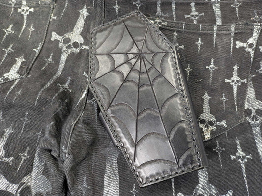 Spiderweb Long Leather Wallet | Gothic Mens Bifold Wallet | Handmade Black Embroidered Web