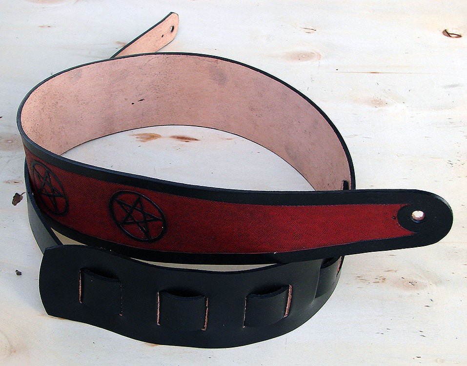 Guitar and bass strap in cow leather handmade by us. Hand engraved pentagrams design. Multiple adjustment points that go up to 140 cm.