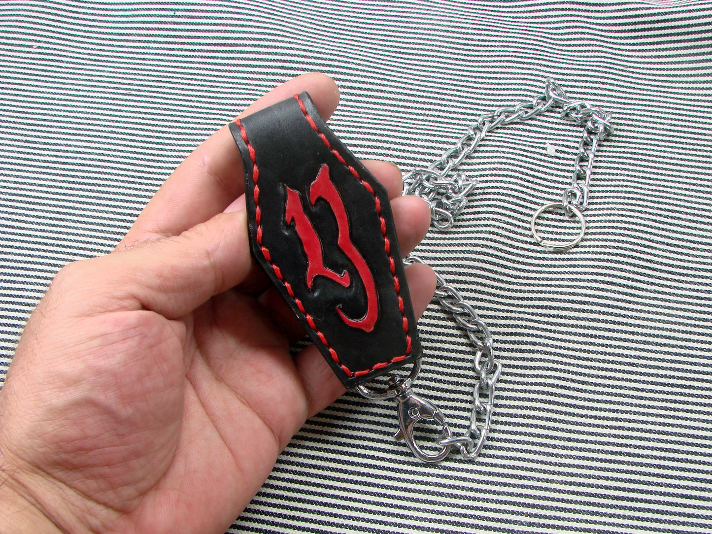 Exceptional Craftsmanship & Unique Design: This distinctive chain is crafted from high-quality vegetable-tanned cow leather, a premium material known for its exceptional durability, robustness, and how it beautifully ages, developing a rich, authentic patina. The centerpiece is the bold number 13, meticulously hand-tooled in relief onto a striking coffin-shaped leather piece, painted in vibrant red against a sleek black background. Every detail is highlighted by precise hand-stitching with 1mm red waxed thread, ensuring lasting style and exceptional robustness.