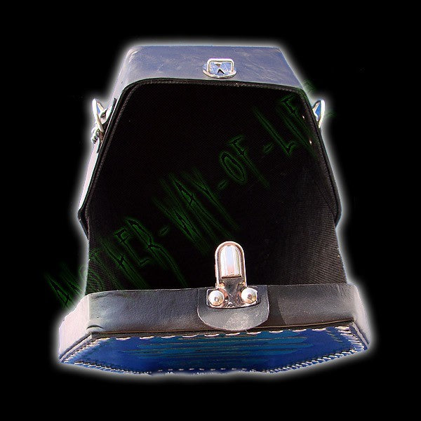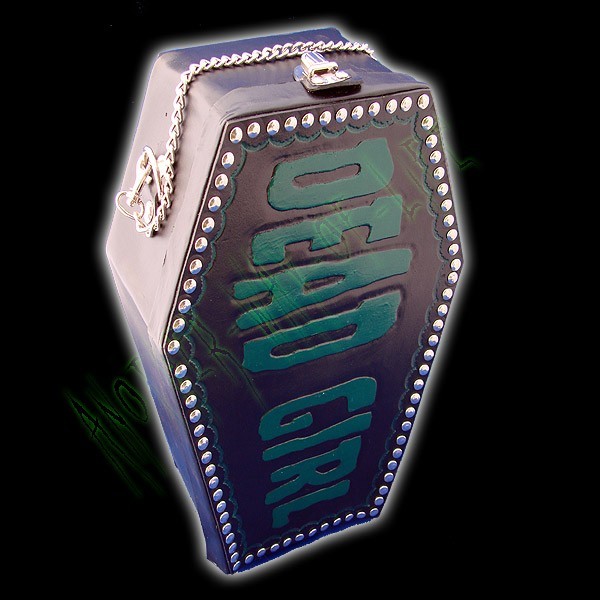 The coffin Handbag is shaped in leather, with the lid engraved and painted black and green.