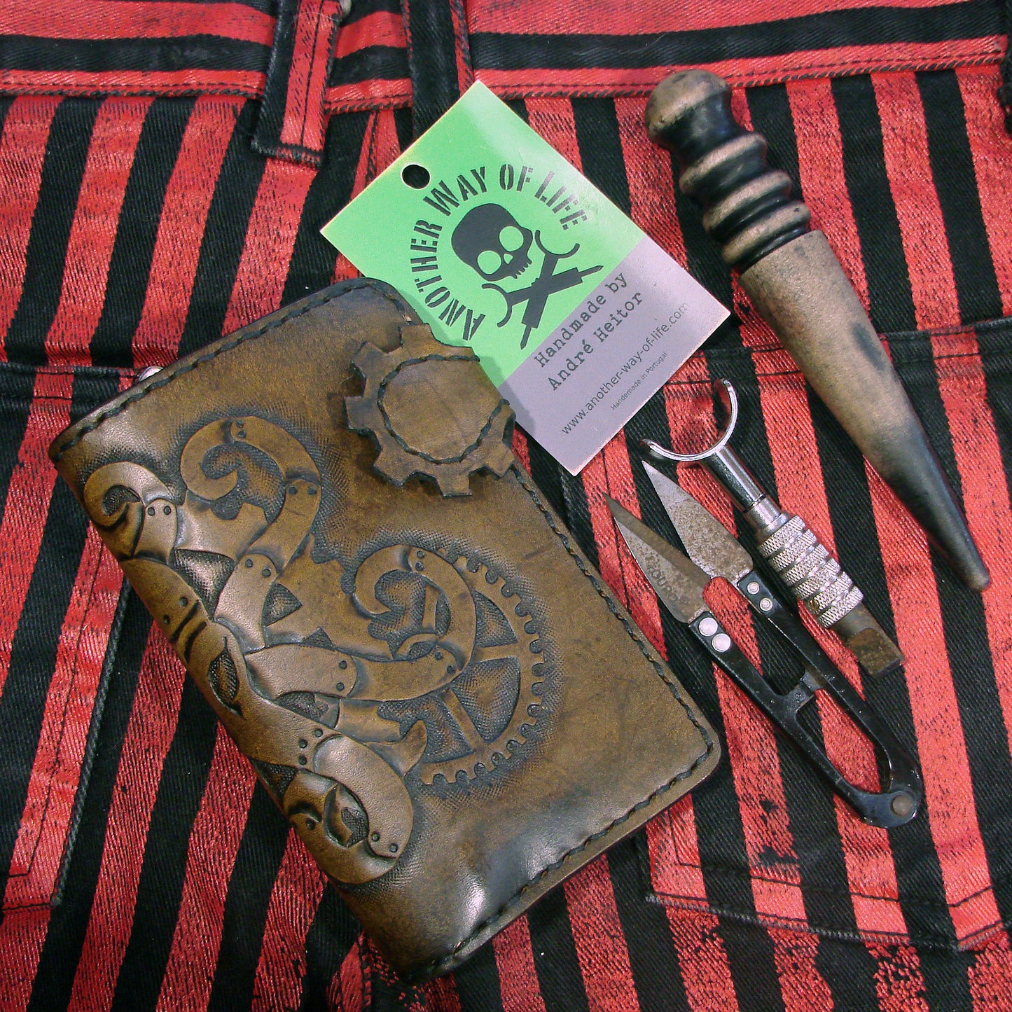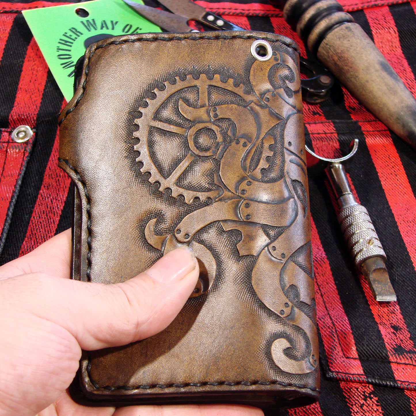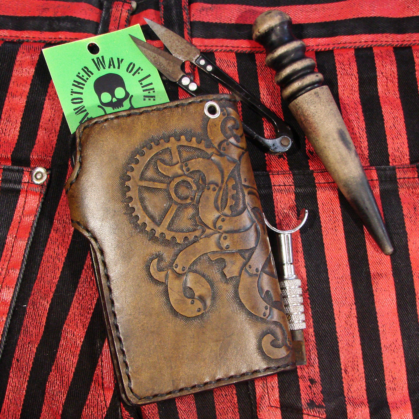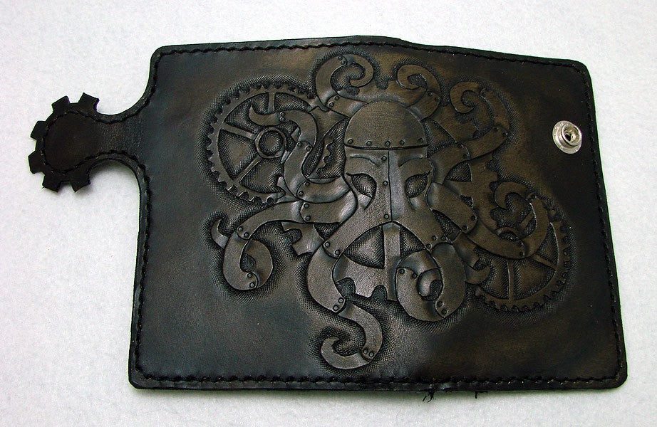 Small octopus steampunk is in cow leather, manufactured by us, have a drawing is hand engraved embossed octopus steampunk, with one large pocket for notes and documents, 3 small pockets for cards like ATM and zip pocket for coins.