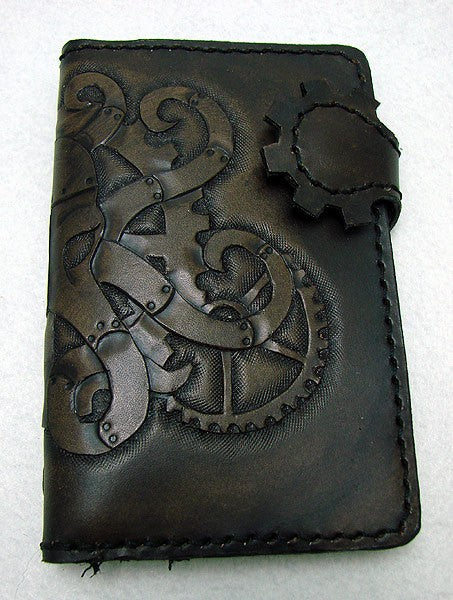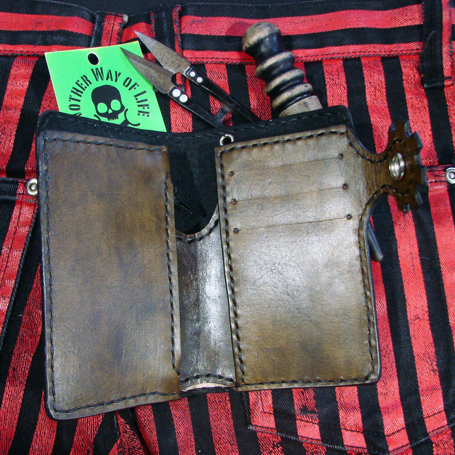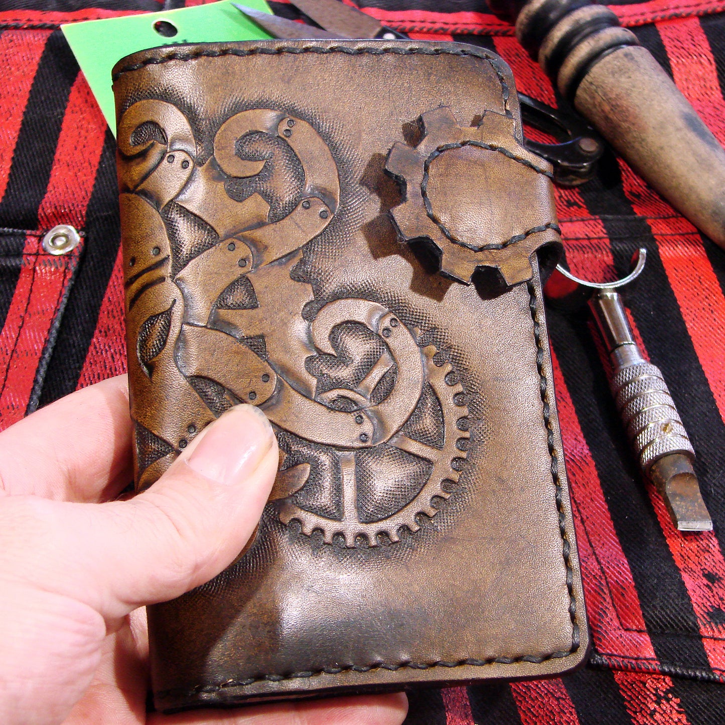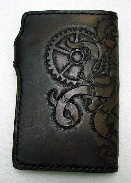 Small octopus steampunk is in cow leather, manufactured by us, have a drawing is hand engraved embossed octopus steampunk, with one large pocket for notes and documents, 3 small pockets for cards like ATM and zip pocket for coins.