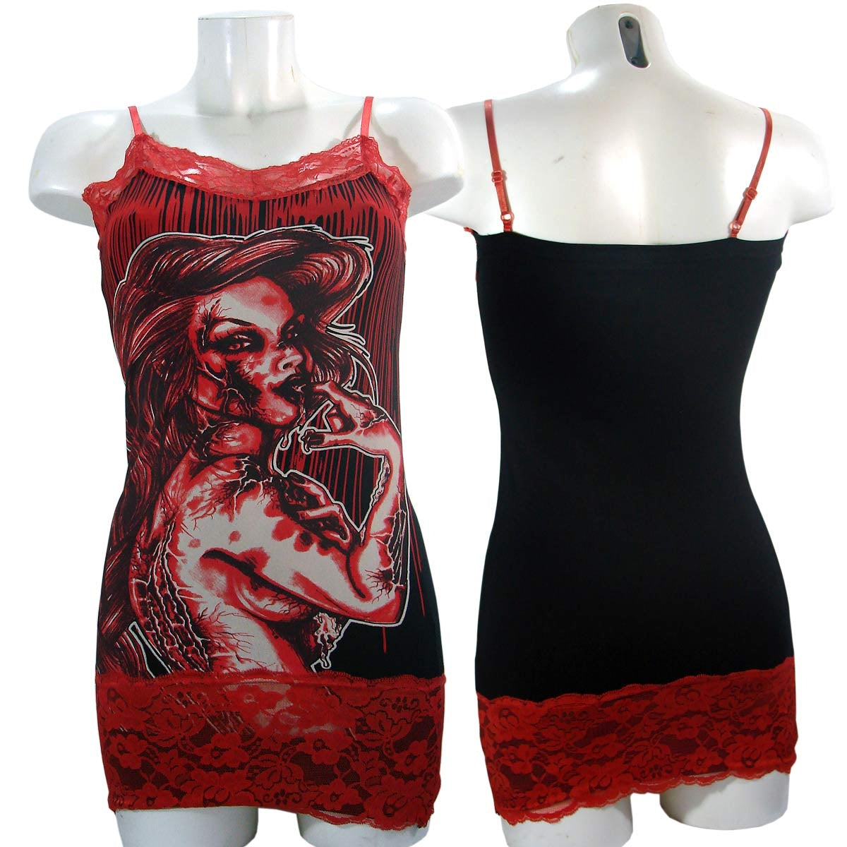 Women Camille Brains Strap Top with zumbie woman stamp, adjustable straps. It has lace in red in the part of the chest and around the waist. In black and red.