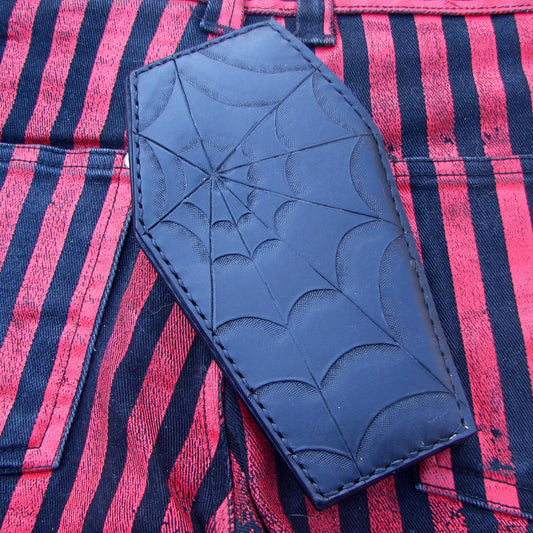 Carteira Caixão Artesanal - Couro Vegetal - 13 Vermelho e Teia de Aranha Gravados à Mão - Feito em Portugal