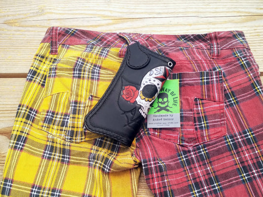 Carteira estilo motociclista em couro curtido vegetal - Design exclusivo com caveira de açúcar