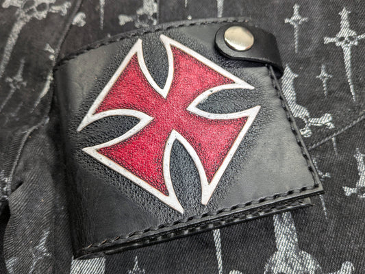Carteira Masculina Biker Artesanal | Couro Preto | Diabo Vermelho & Cruz de Ferro | Feito em Portugal