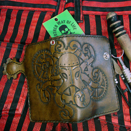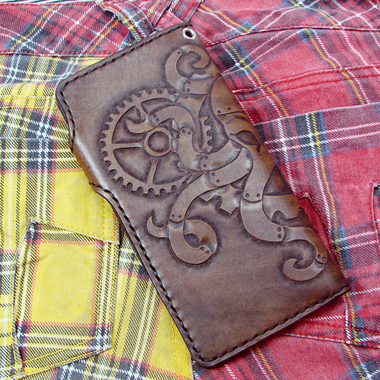 Carteira de Couro Vegetal Artesanal - Polvo Steampunk Gravado à Mão - Estilo Motoqueiro Longo