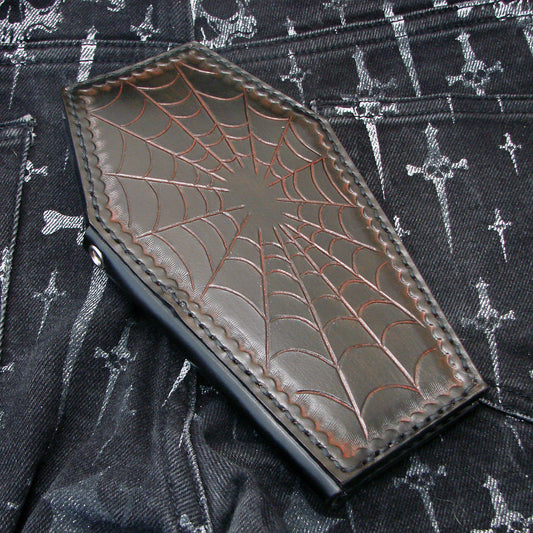 Carteira Caixão Artesanal - Couro Vegetal - 13 Vermelho e Teia de Aranha Gravados à Mão - Feito em Portugal