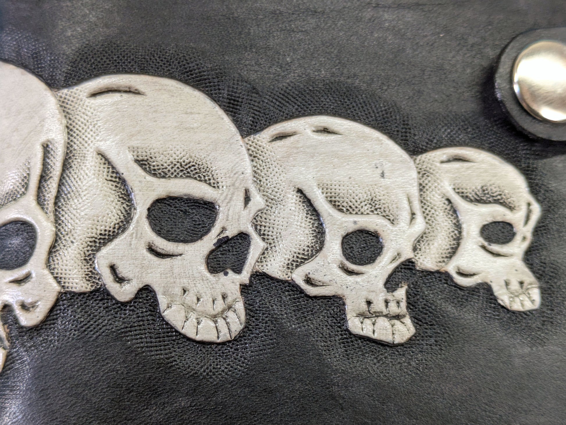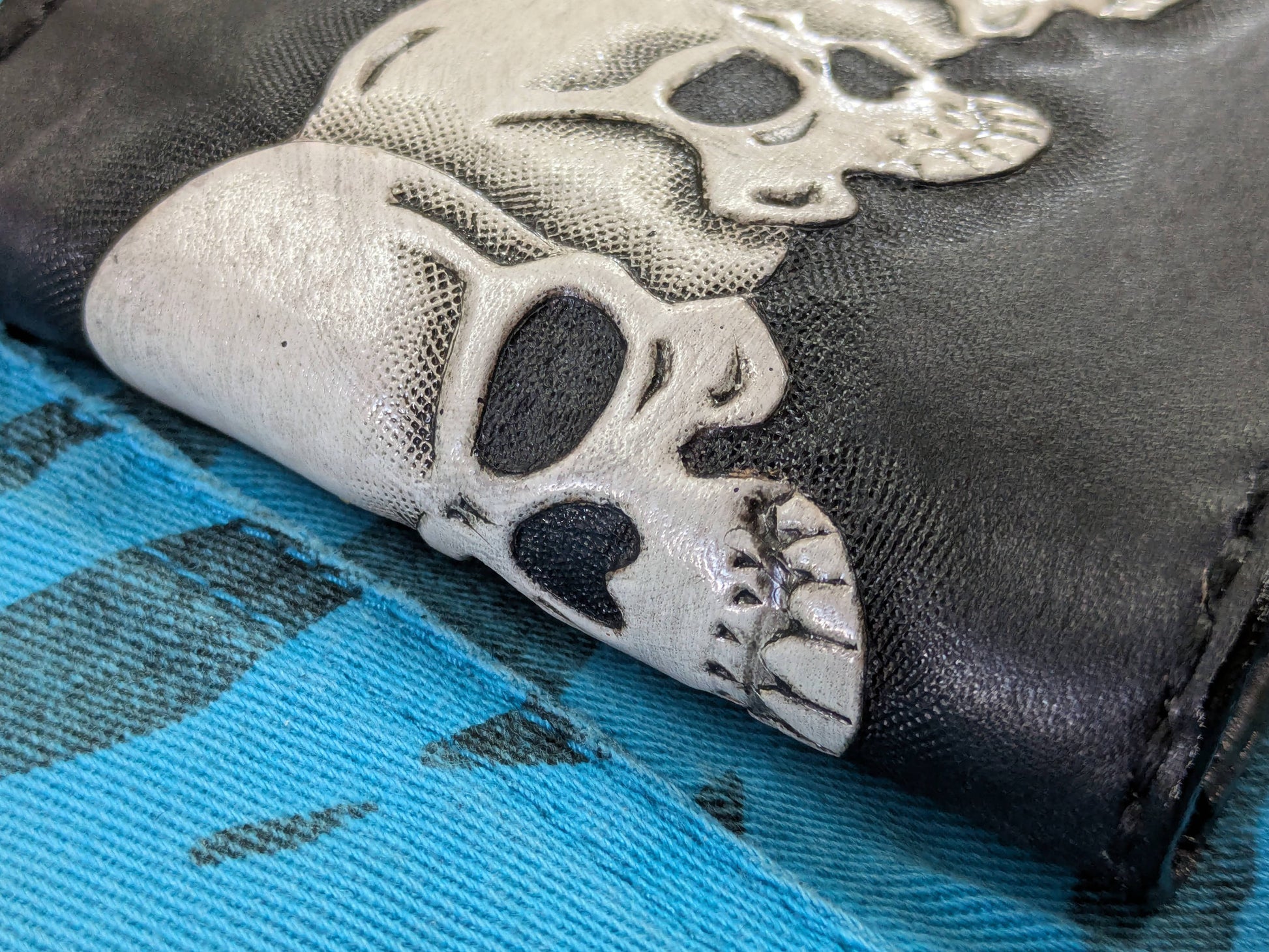Carteira Bifold em Couro Caveiras Feita à Mão | Carteira Gótica Motard Masculina Única