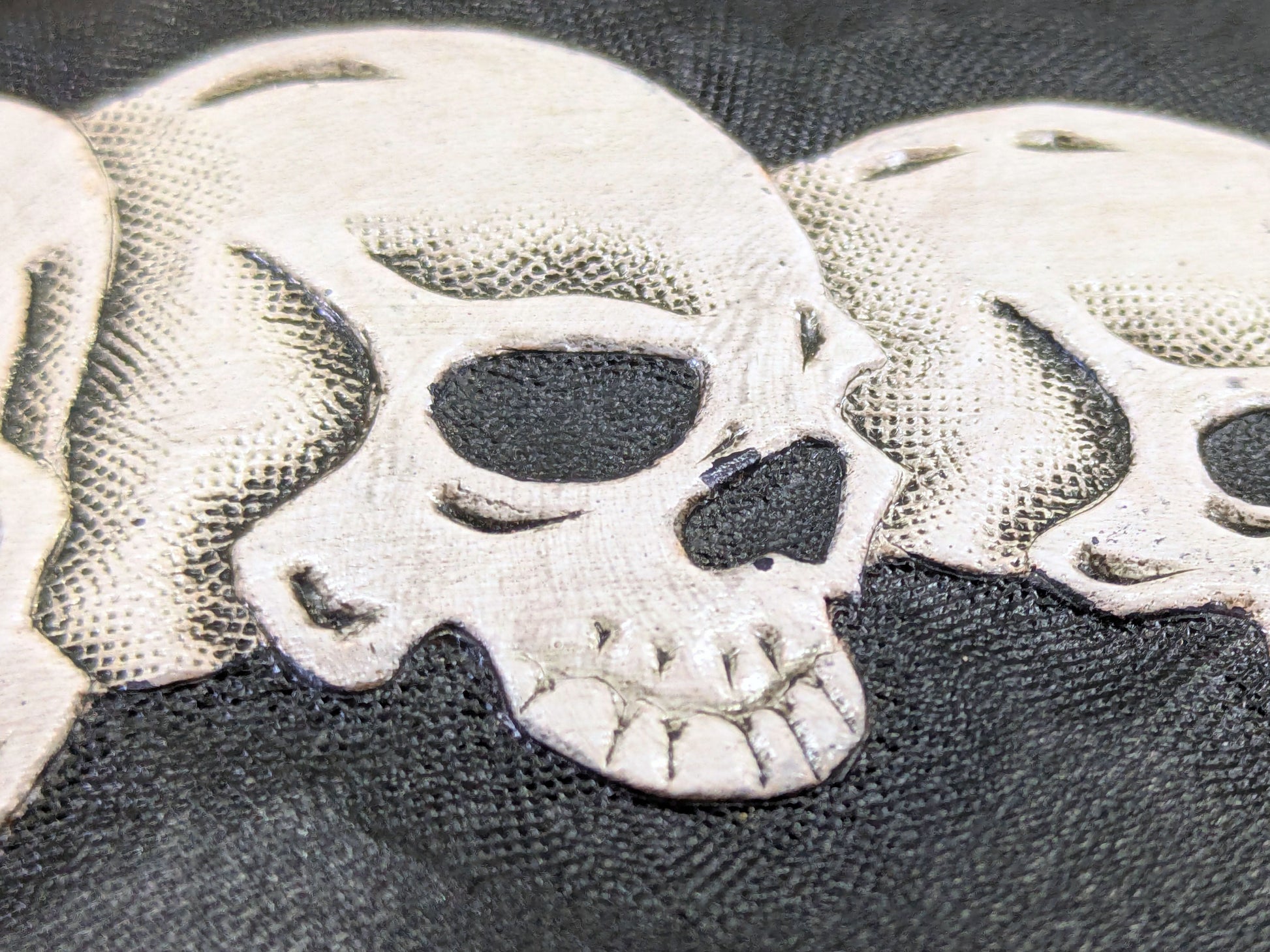 O marcante design de caveiras é gravado à mão com relevo intrincado, conferindo-lhe um apelo tátil e visual distintivo que a destaca.