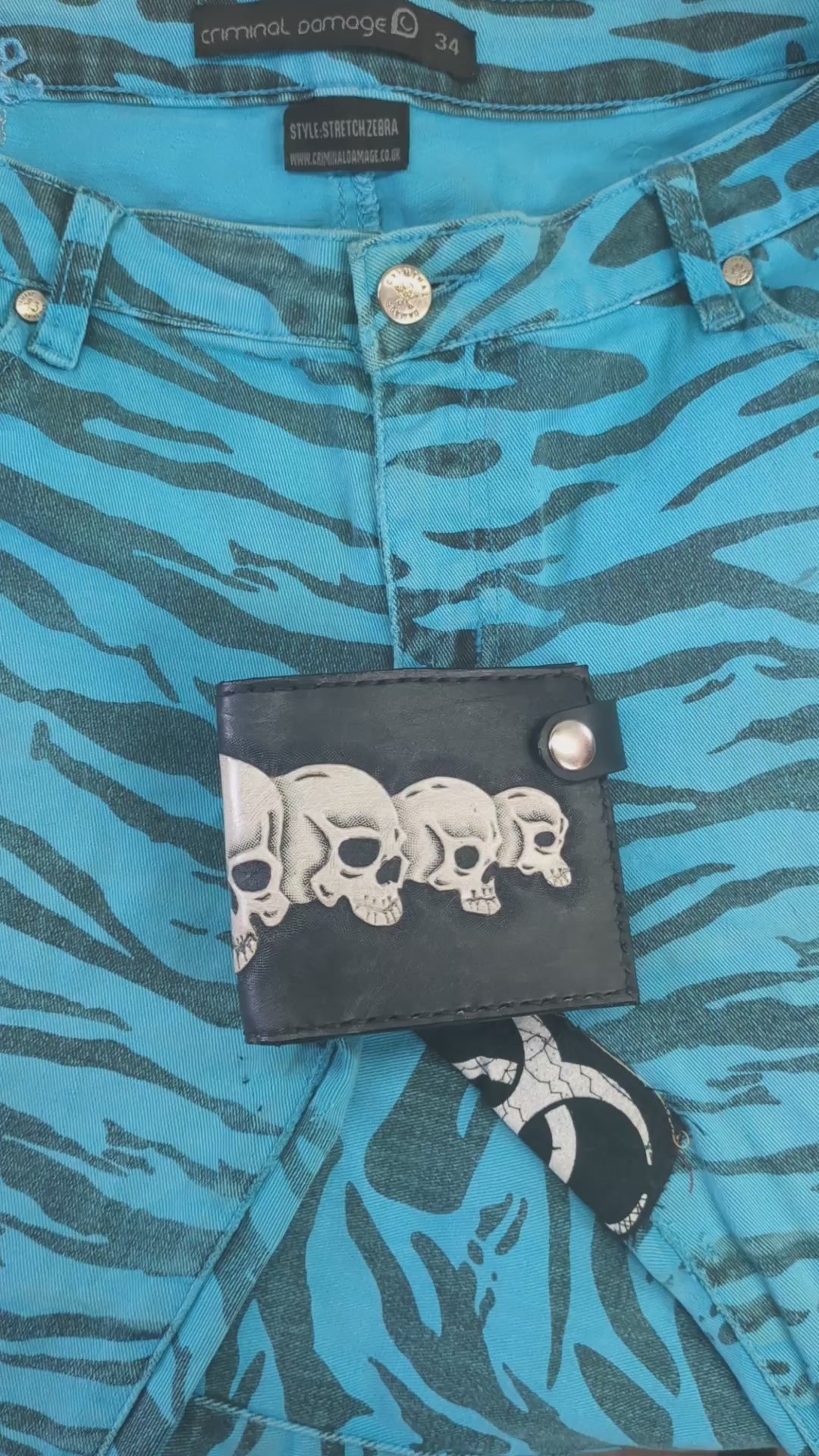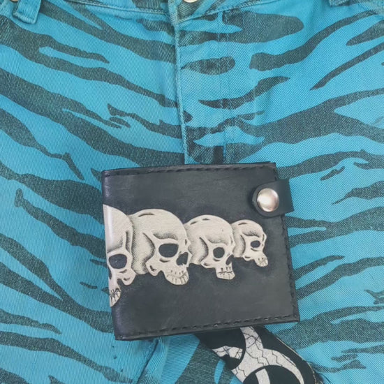 Perfeita como um presente único para homem, um acessório punk ou gótico, ou simplesmente como uma peça marcante para o teu uso diário. Adiciona esta carteira de couro com caveiras à tua coleção e mostra a tua individualidade!