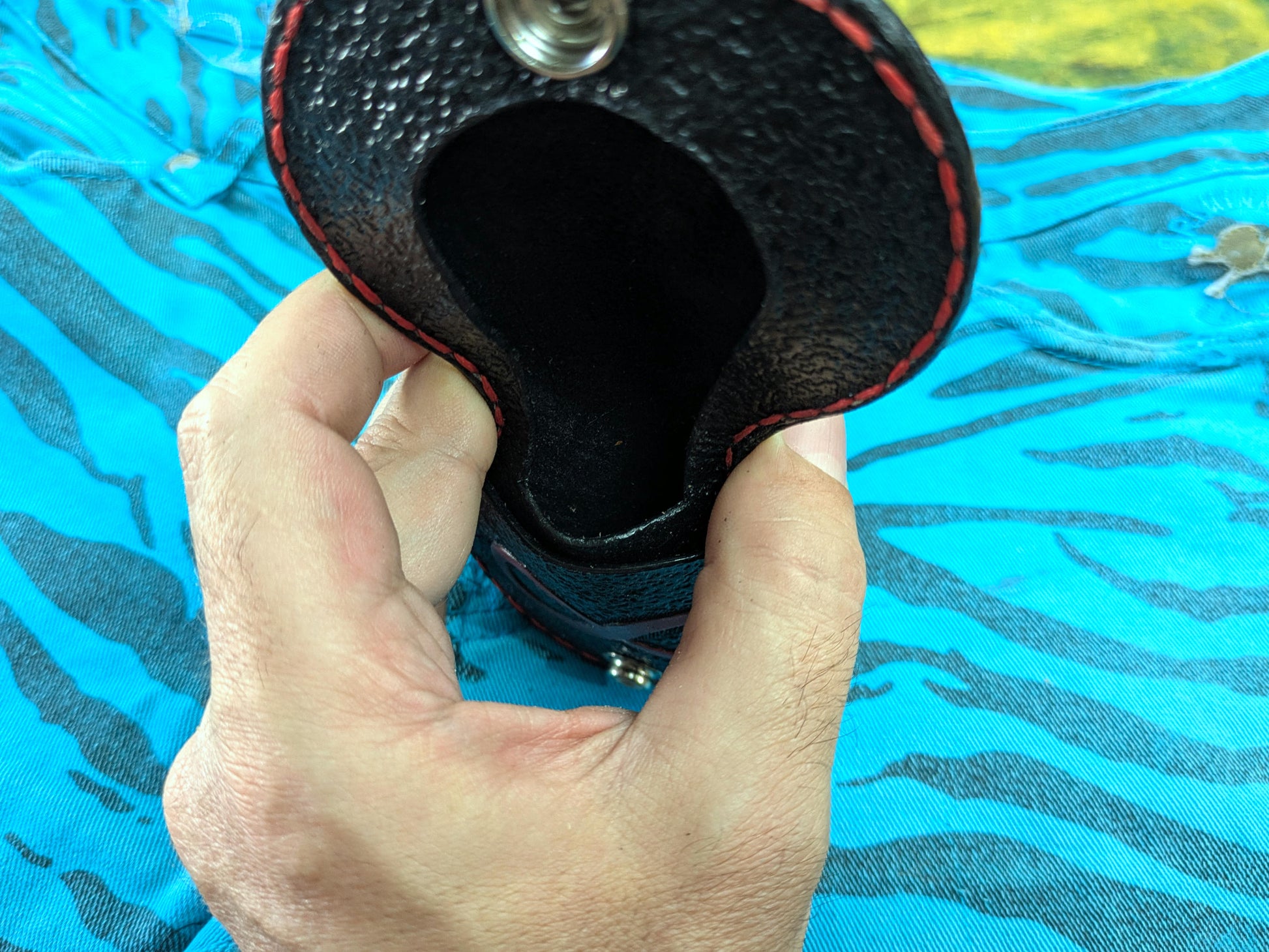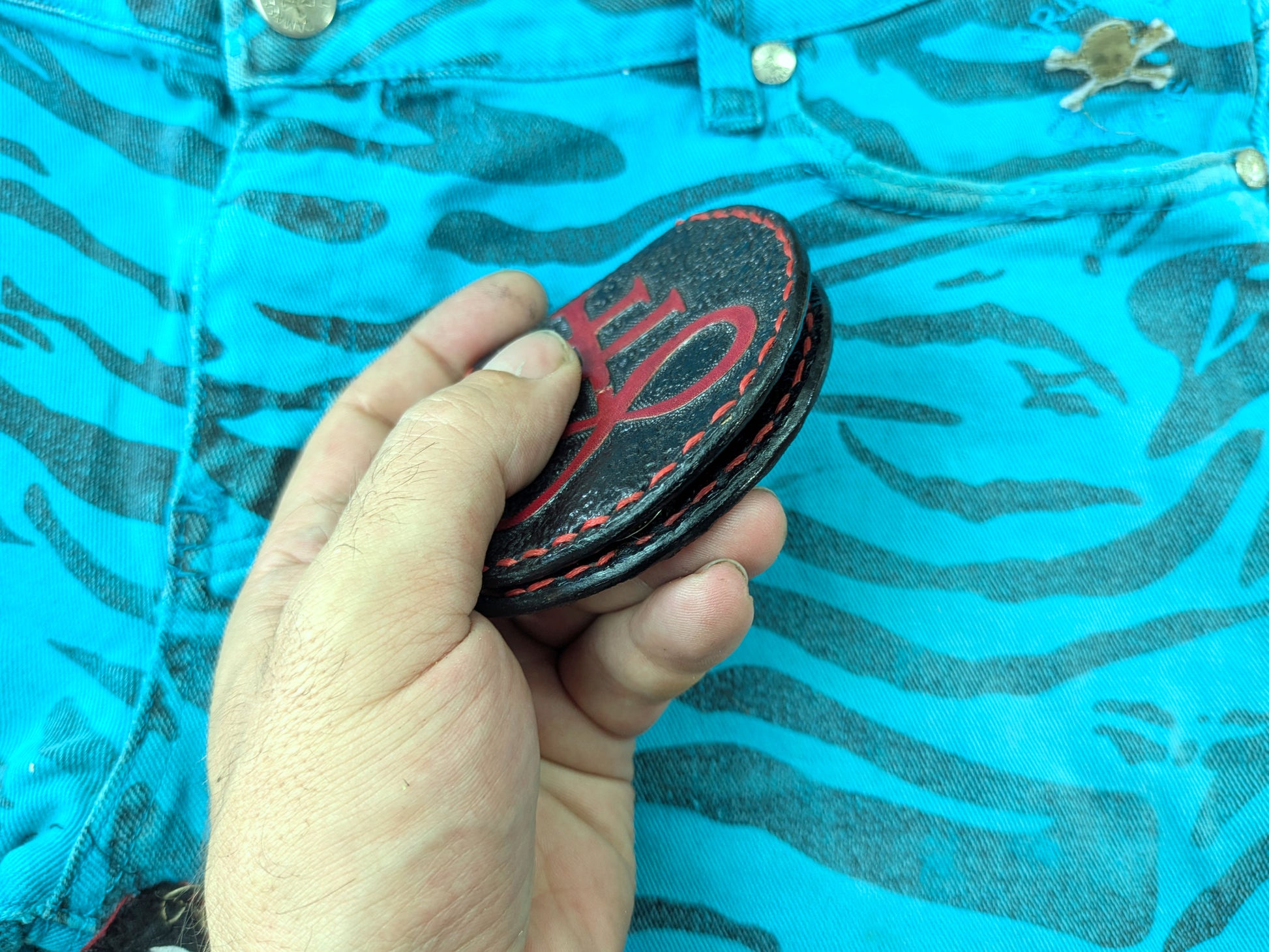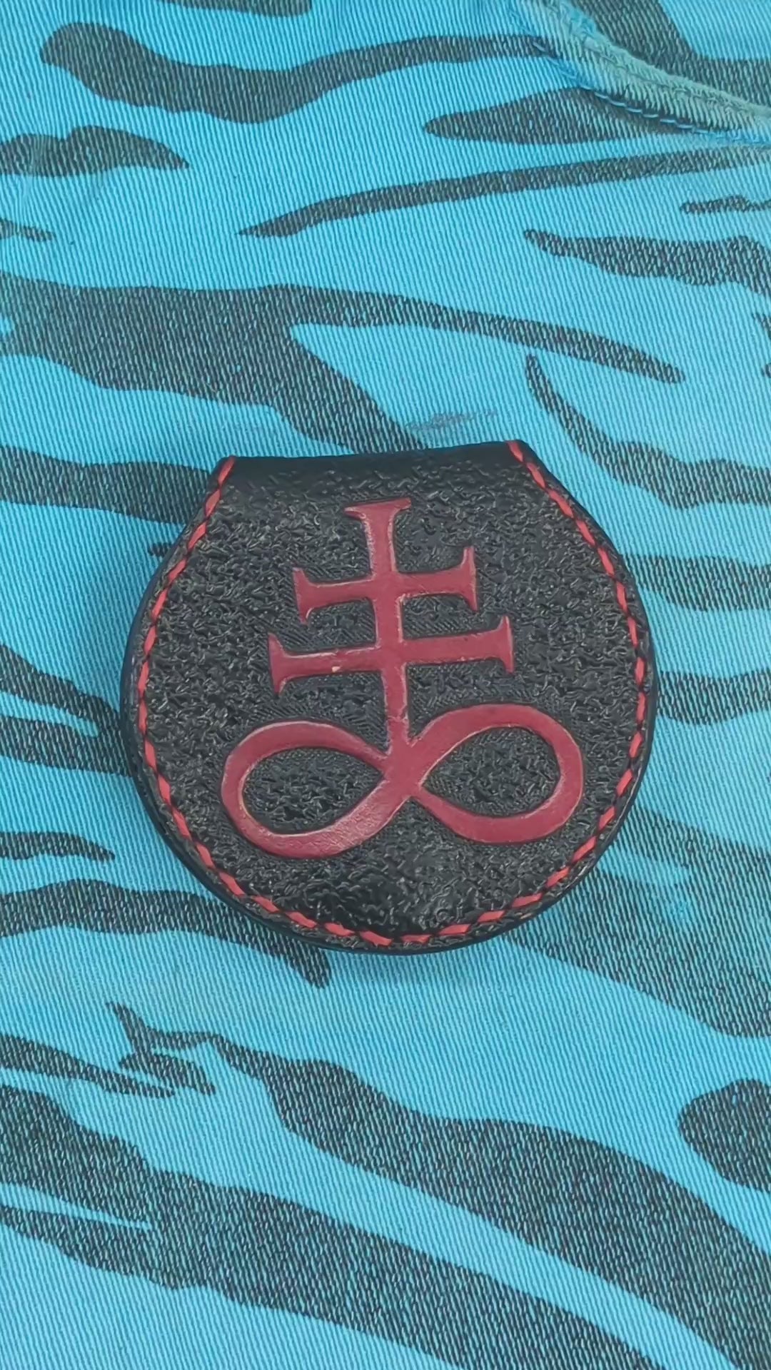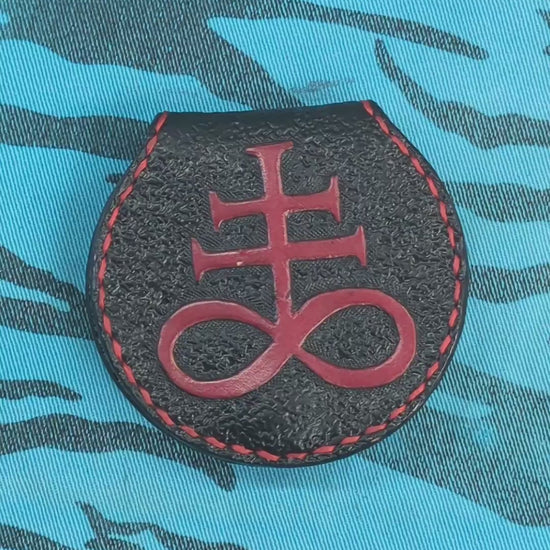 Criado inteiramente a partir de couro curtido vegetalmente (vegetable-tanned leather) de primeira qualidade, este porta-moedas apresenta a proeminente Cruz de Leviathan (Cruz Satânica) gravada à mão e pintada num vermelho vívido no seu centro.