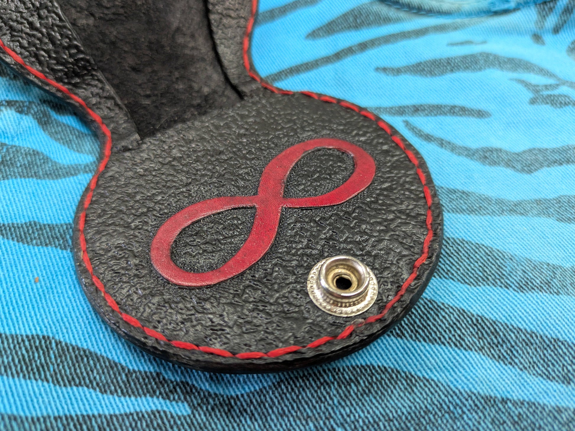 Ao abrires, irás descobrir o Símbolo do Infinito também gravado à mão e pintado em vermelho sobre o mesmo couro preto texturizado.