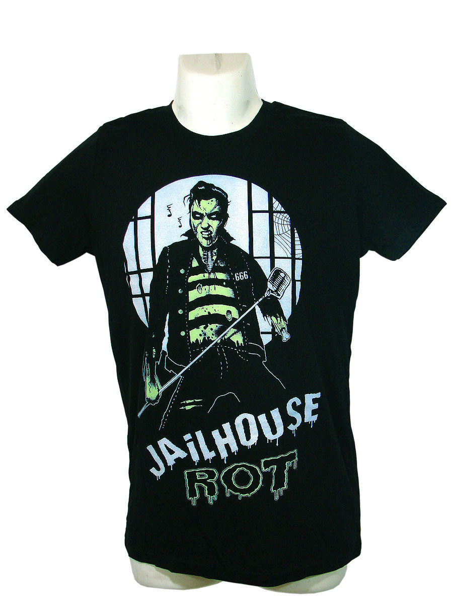 T-Shirt Preta Masculina Jailhouse Rot em Algodão Leve. Apresenta um design de Elvis zombie/Frankenstein com uma vibe rockabilly e psychobilly, numa alusão à música "Jailhouse Rock".